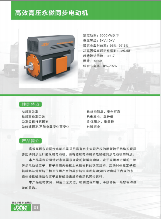 高效高压永磁同步电动机是采用具有自主知识产权的新型转子结构实现异步起动同步运行的永磁电动机,兼有感应电动机和电励磁同步电动机的特点。